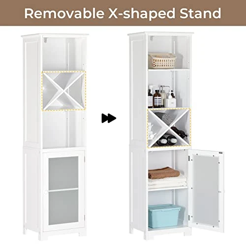 - Space Saving Design: 3 open shelves (have a removable X-shaped rack)1 closed tempered glass door( Two storage compartments are adjustable)have large capabilities meet all your storage to hold your daily essentials,keep your bathroom neat and organized.