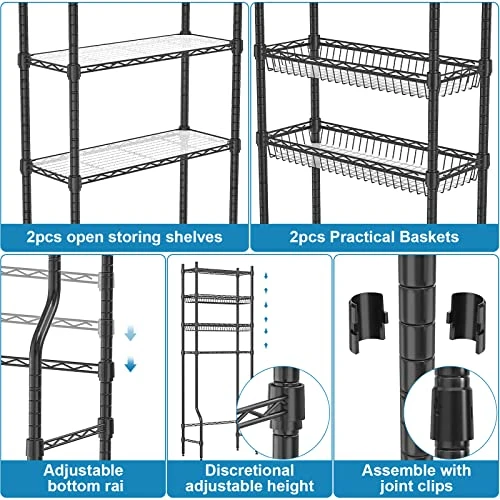 - [Multifunction & Adjustment] This toilet shelf organizer is multifunctional and highly adjustable, with 2 utility baskets and 2 open storage shelves. You can customize the height of each unit to fit your unique needs. Plus, the leveling feet and bottom stabilizer bar protect your floors from scratches and rust, making our shelf a long-lasting investment for your bathroom.