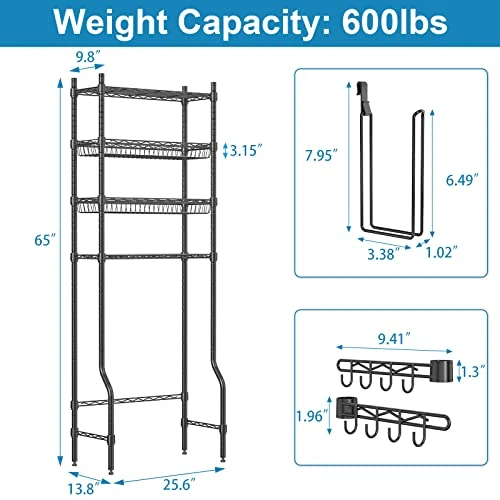 - [Upgrade 4 Tier Large Space] We’ve upgraded our toilet shelf to 4 tiers of large storage space. Our shelves provide ample room for all your bathroom needs, and we even include a toilet paper holder and 2 hangers. You won’t find a better solution for maximizing your bathroom storage.