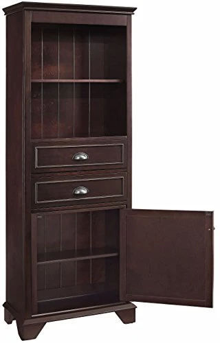 - Organize your bathroom with open storage with shelving, two spacious drawers, and a large bottom cabinet