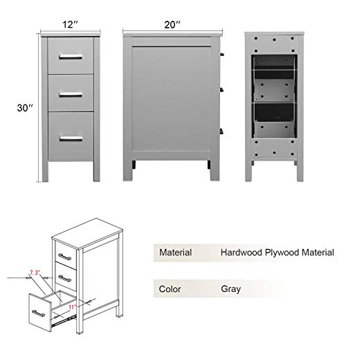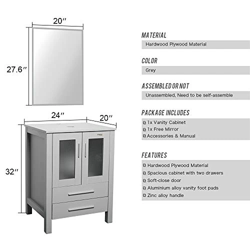 - DIMENSION: 24’’ L x 20’’ W x 32’’ H Grey bathroom vanity; 20” W x 27.6” H mirror; 12”L x 20”W x 30” H White side bathroom cabinet; provides excellent storage for bathrooms with limited space; suitable for small space bathroom and restroom; Four drawers for you to storage(3 Packages will be send).