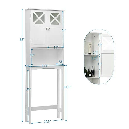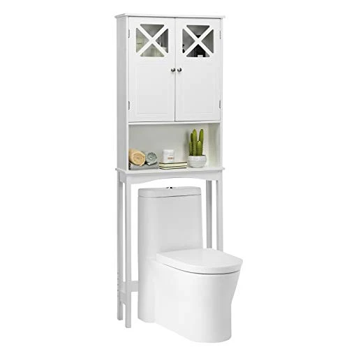 - 🚽【2-tier Cabinet with doors & Open Shelf】This over the toilet storage unit features an open shelf and a 2-tier cabinet with doors, providing a mix of open and concealed storage inside the bathroom. The 2-tier cabinet has a 3-level adjustable shelf. In this way, you can customize your storage space height freely according to the height of the stored items. And with magnetic suction device, cabinet doors can be closed tightly and thus protect your item from dust or falling. Meanwhile, two transparent tempered glasses add charm and enable partial inner view visible. Additionally, the open shelf keep your frequent essentials within your easy reach.