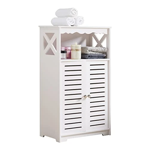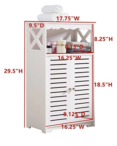 - The large cabinet with one interior shelf is perfect for all your bathroom essentials: towels, toilet paper and more, while the upper exposed shelf gives easy access to your daily toiletry needs.