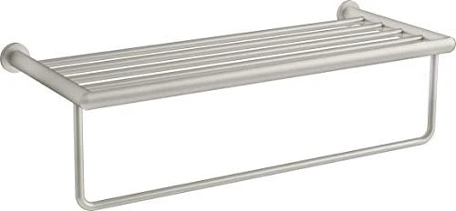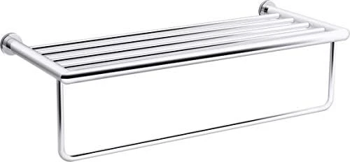 - Spacious upper shelf with towel bar below provides additional storage in bathroom space