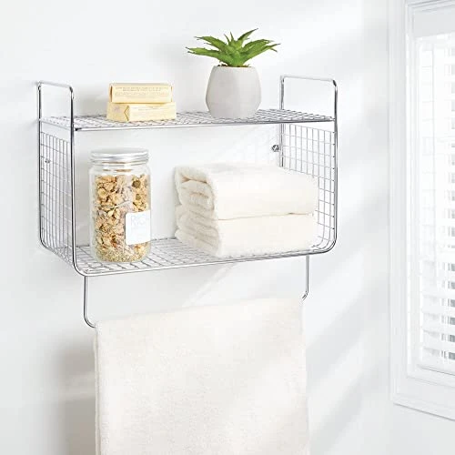 - MAXIMIZE SPACE: This large shelving unit is perfect for holding extra supplies of facial tissue, toilet paper, bar soap, bath salts, sugar scrubs, shampoo, conditioner, wipes or even cleaning supplies; Great for storing bathroom essentials or use it as a decorative wall accent; Towel Bar conveniently keeps fresh hand, face and bath towels or washcloths at your fingertips; Perfect for homes, apartments, condos, dorm rooms, campers, RVs and cabins