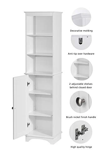 - STURDY AND CLASSIC: This floor storage cabinet includes a tip-over restraint device for increased safety and stability. The tall bathroom cabinet features a classic white finish, carved with clean lines and a simple silhouette, offering a modern and elegant look to your home.