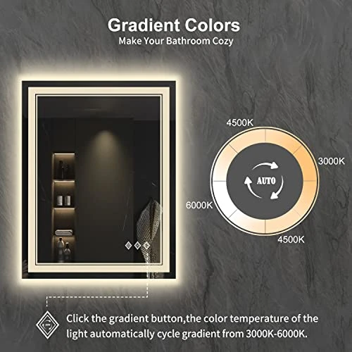 - ✨【3 Color Temperatures】 3000k (warm light), 4500k (natural light), 6000k (white light) are integrated in this LED mirror. The brightness can be adjusted. Just click the light button to switch the color temperature, and long press it to adjust the light brightness.