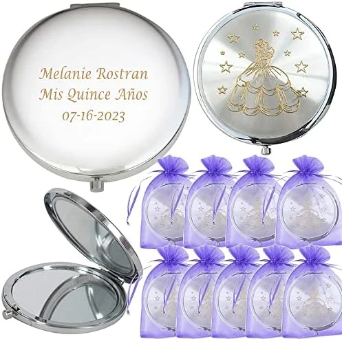 - This Quinceañera compact mirror Favors are beautiful and last forever. Your guests will love them! Text is Permanently laser engraved on the back of the compact mirror,